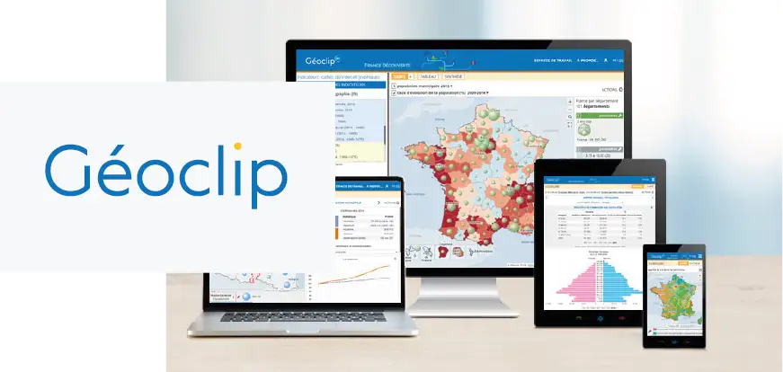 Géoclip est un outil de référence pour la création d’observatoires géostatistiques en mode web. Il permet d’explorer, analyser, comparer et partager un large éventail d’indicateurs localisés à travers des représentations cartographiques et graphiques d’une qualité irréprochable, grâce à des fonctionnalités adaptées aux besoins des statisticiens comme à ceux des non-spécialistes :